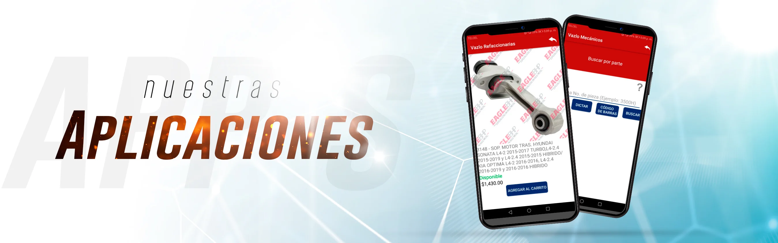 Aplicación para consulta de catálogo electrónico, con más de 10,000 productos disponibles del EagleBHP colombia: soportes para motor y transmisión, bases de amortiguador, suspensión y dirección, cubrepolvos, juntas homocinéticas.